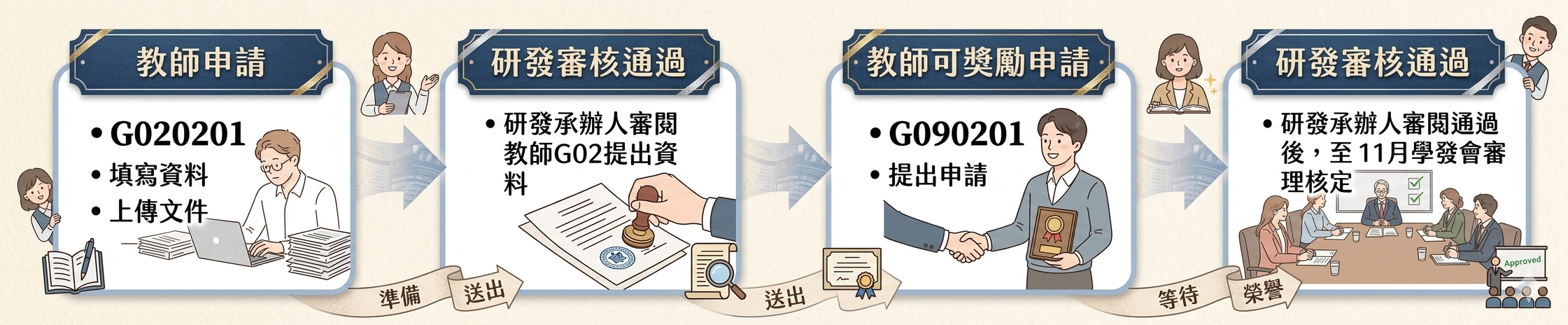 校務資訊系統(新)→研發系統→G09研發論文獎勵系統→申請作業→教師論文獎勵申請(G090201)。